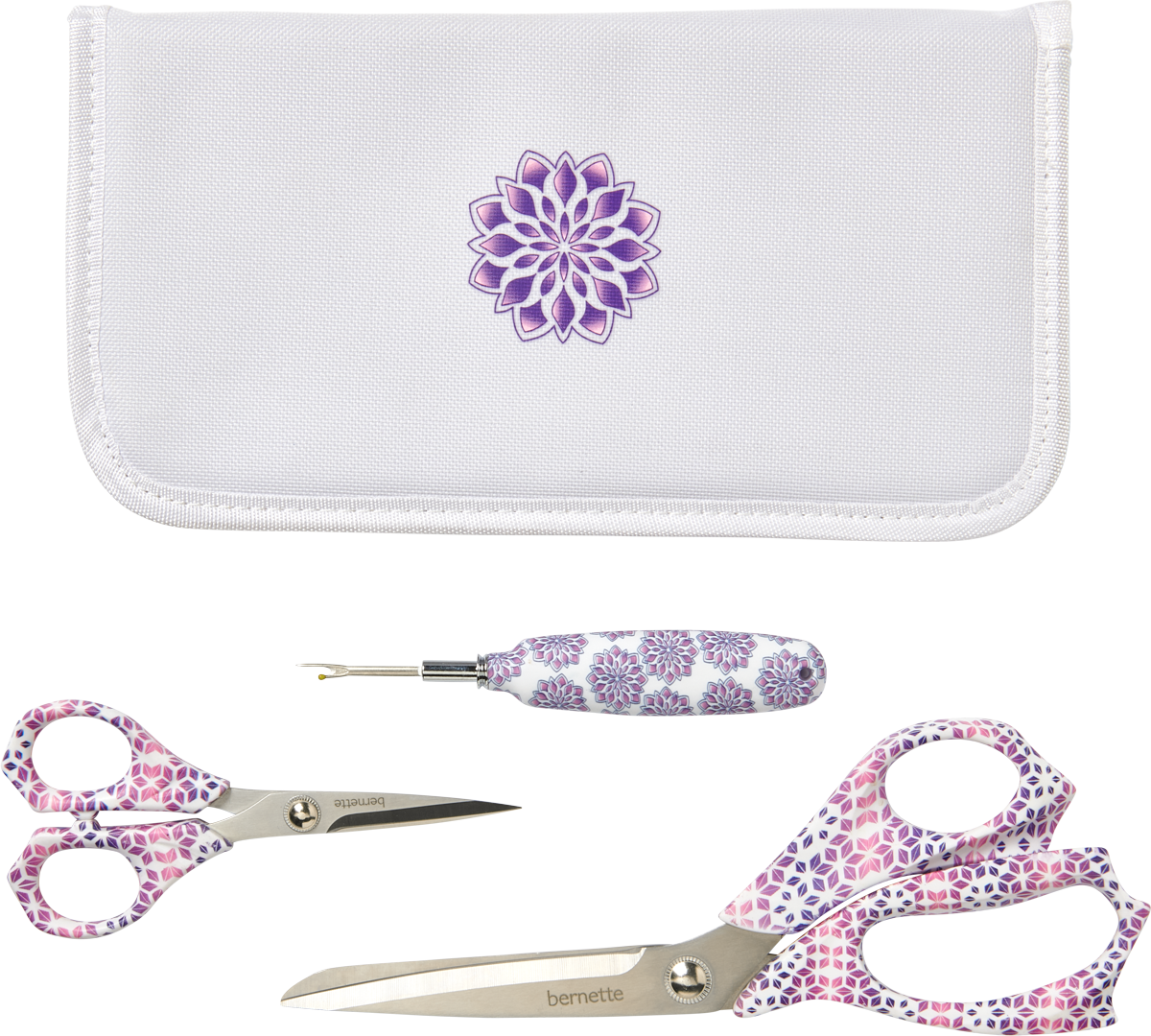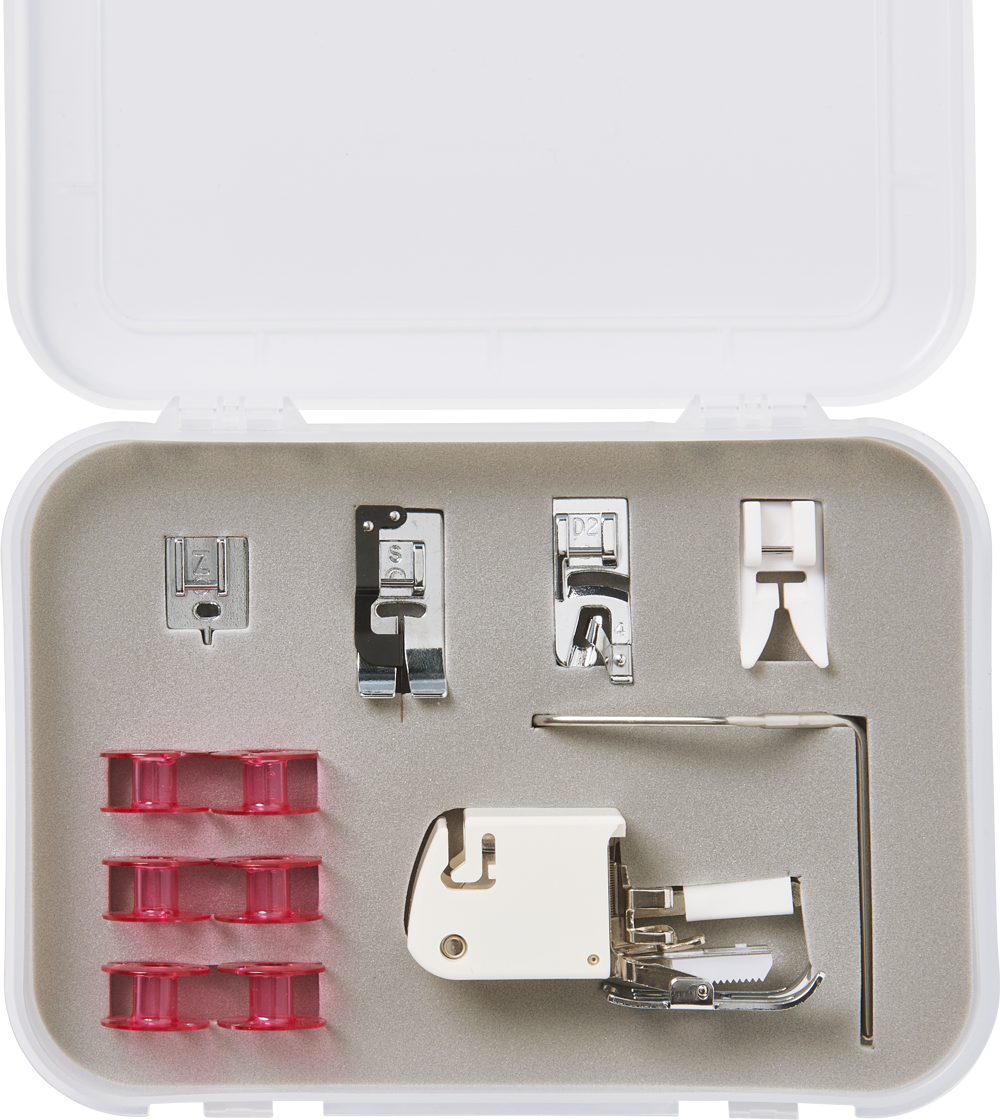 Im Lieferumfang ist ein exklusives Zubehörset enthalten. Folgende Nähfüsse helfen dir bei der Umsetzung von kniffligeren Passagen im Projekt: Reissverschlussfuss für nahtverdeckte Reissverschlüsse, Schmalkantfuss, Säumerfuss, Zick-Zackfuss mit Gleitsohle, 6 Unterfadenspulen in pink, Obertransportfuss und eine Kantenlineal rechts. Auch mit dabei ist ein Scheren-Set mit einer Stoffschere, einer Fadenschere und einem Pfeiltrenner - natürlich im passenden Look.