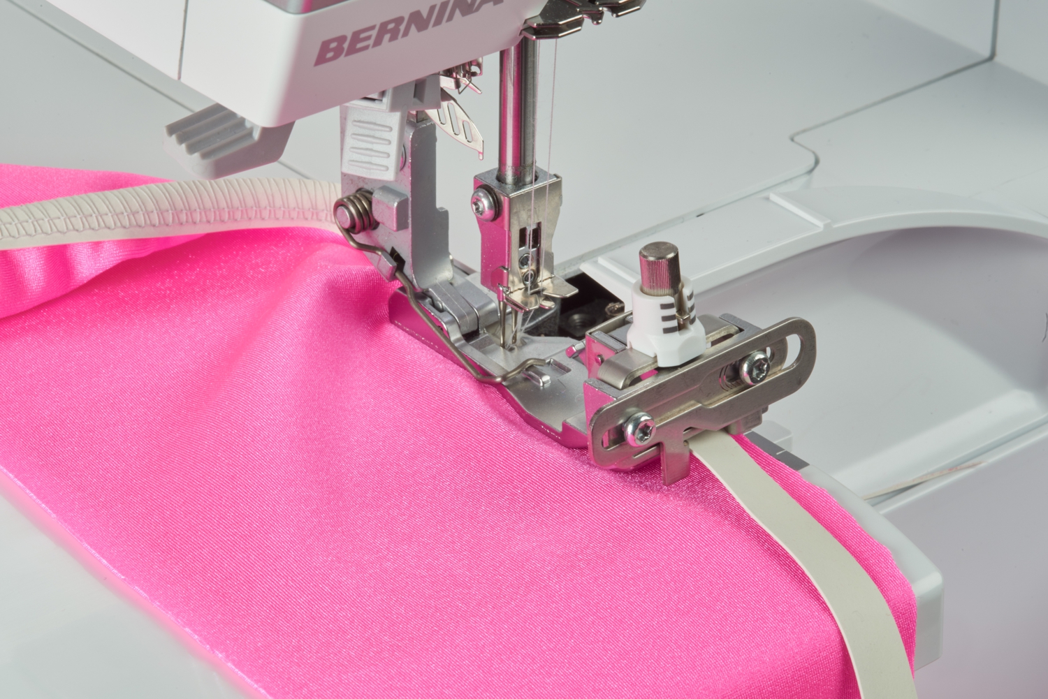 The elastic band sewing foot automatically guides and stretches the elastic band as you sew. Ideal for lingerie, swimwear, sportswear and home textiles.