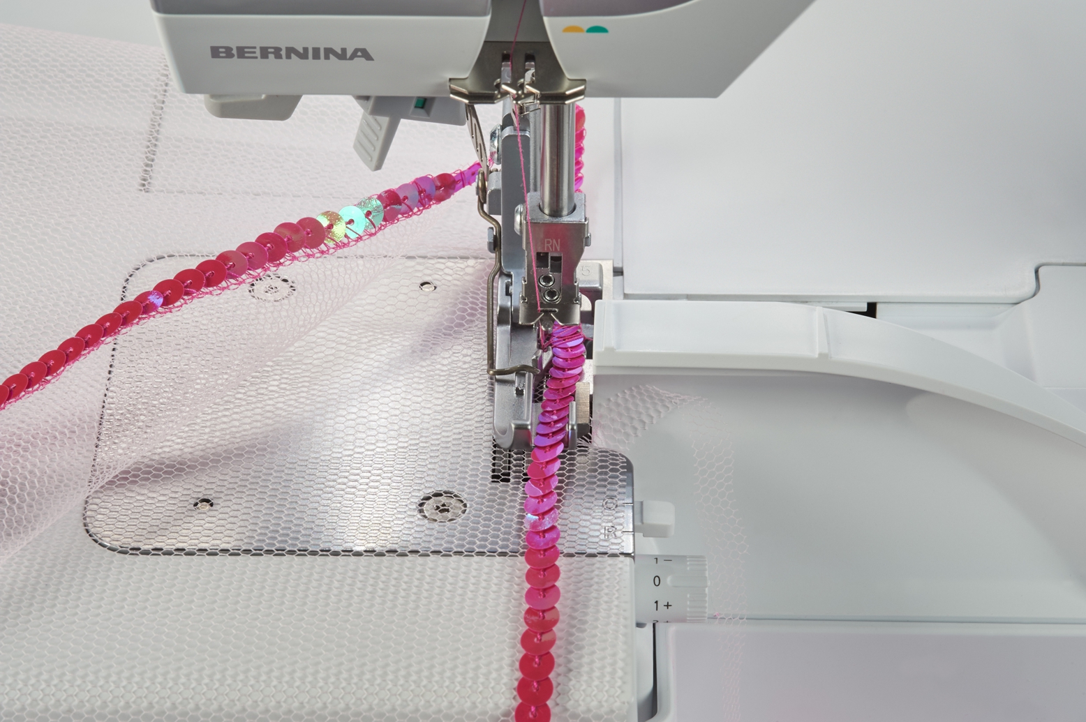 With the bead and sequin foot, bead and sequin cords with a maximum diameter of 6 mm can be sewn on quickly and easily. It is used for beautiful finishes on fabric edges or for decoration on flat seams . In combination with the right seam guide ruler as a guide aid, the seams are particularly precise.
